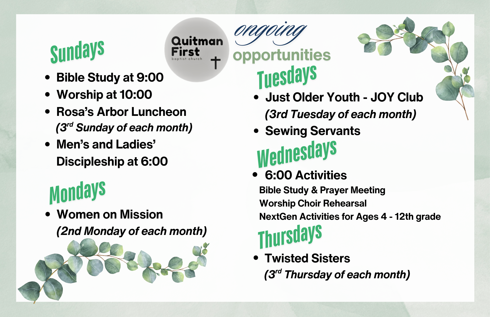 As you arrive, you’ll notice parking on both sides of the church with our main parking area in the back. Upon entering, one of our friendly greeters can direct you to the sanctuary or a Bible Study class of your choice.